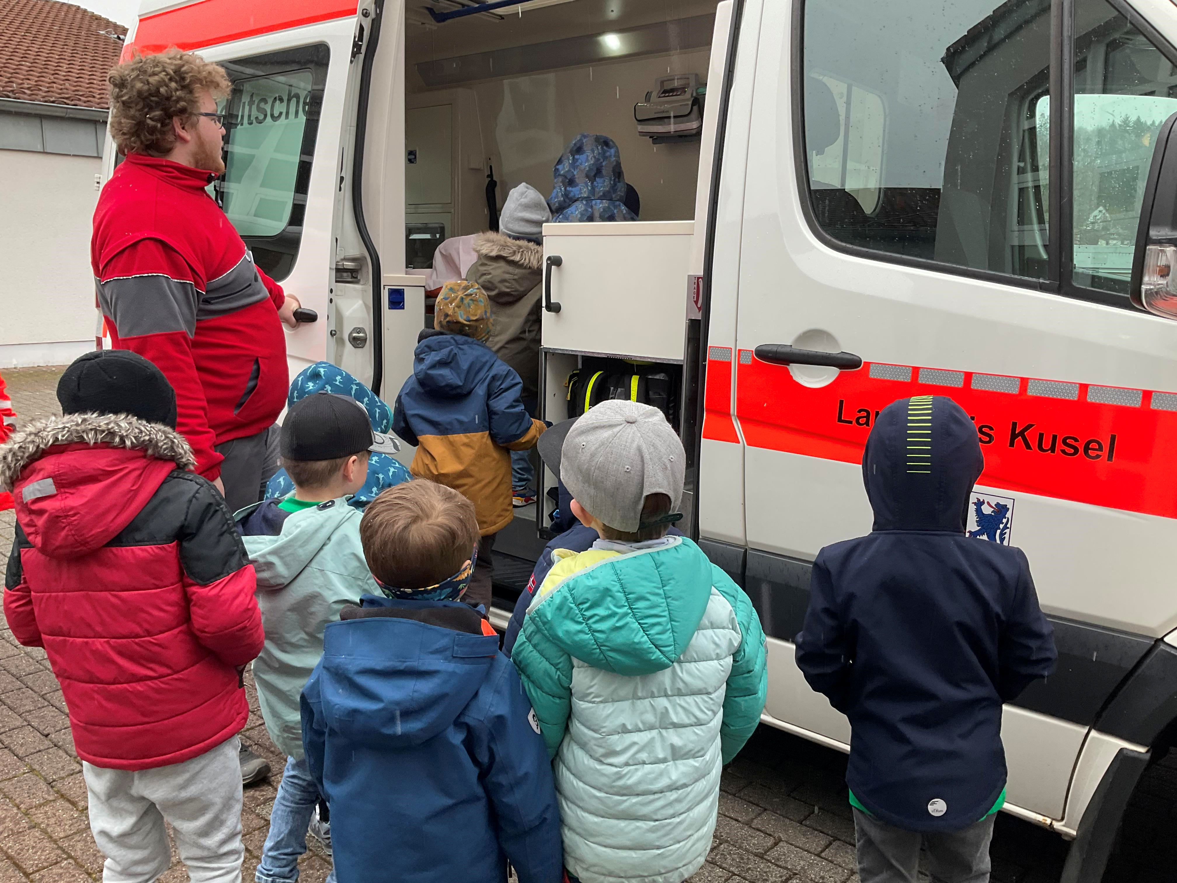 Gelungene Aktion in der Integrativen Kita der Lebenshilfe Kreisvereinigung Kusel e. V.: Für die Vorschulkinder der integrativen Kita stand am Donnerstagmorgen etwas ganz Besonderes auf dem Plan: ein 1. Hilfe Kurs für Kinder! Nach dem Frühstück ging es für die Kleinen ans Eingemachte. Ein Team vom DRK Kreisverband Kusel e. V. wartete auf die neugierigen Schulanfänger. Die Kinder lernten in dem Kurs unter anderem wichtige Grundlagen wie zum Beispiel den Notruf, Verbände anlegen und andere wichtige Elemente der ersten Hilfe. Als besonderes Highlight durften die Kinder in einen echten Rettungswagen. Die Kinder lernten die Funktionen des Autos kennen und waren restlos begeistert. Der Kurs wurde von den Kollegen des DRK spielerisch und extra für Kinder ausgerichtet aufbereitet. Der Kurs kommt bei den Kindern gut an und soll auch zukünftig angeboten werden. Wir bedanken uns bei dem Kollegen vom DRK für den unvergesslichen Tag!