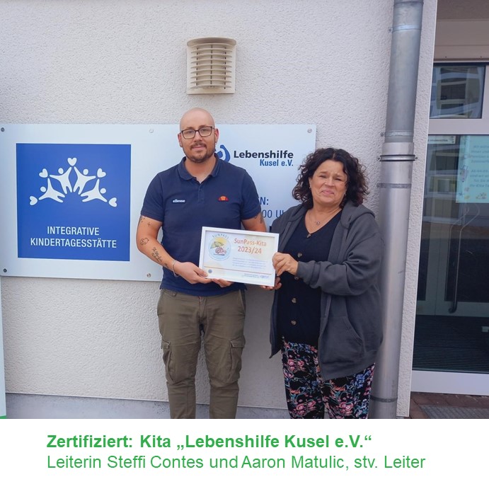 Hautkrebsprävention von Anfang an: Die Krebsgesellschaft Rheinland-Pfalz zeichnete die Integrative Kita der Lebenshilfe Kusel für vorbildlichen Sonnenschutz aus. In Rheinland-Pfalz konnten bislang rund 40 Kitas als Sonnenschutzkindergarten im Rahmen des Projektes „SunPass – Gesunder Sonnenspaß für Kinder“ der Europäischen Hautkrebsstiftung (European Skin Cancer Foundation, ESCF) zertifiziert werden.