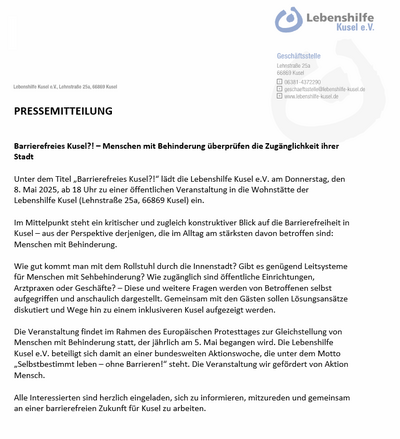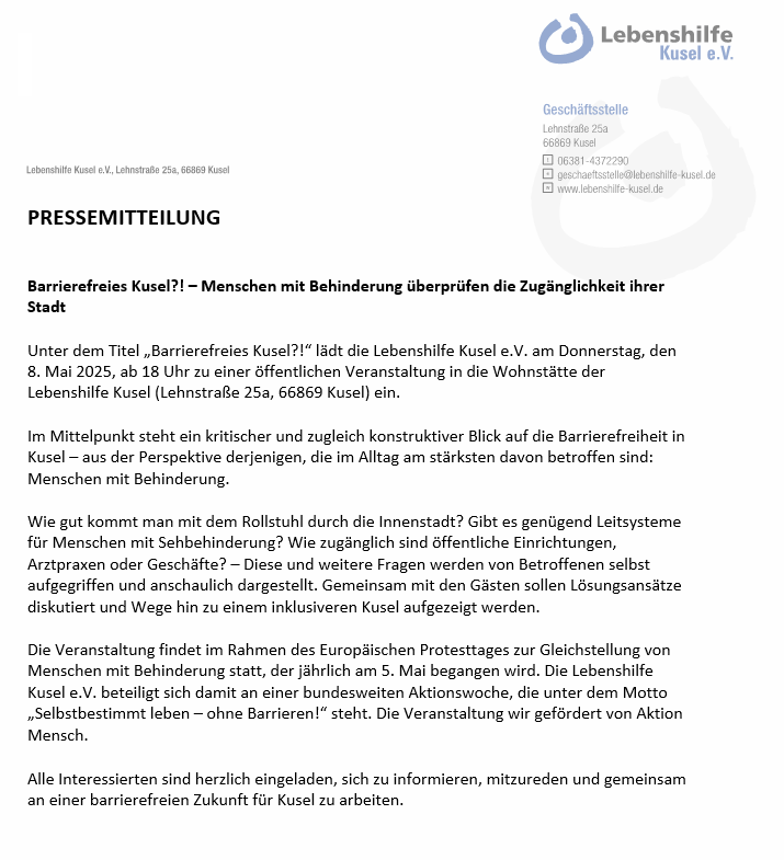 Unter dem Titel „Barrierefreies Kusel?!“ lädt die Lebenshilfe Kusel e.V. am Donnerstag, den 8. Mai 2025, ab 18 Uhr zu einer öffentlichen Veranstaltung in die Wohnstätte der Lebenshilfe Kusel (Lehnstraße 25a, 66869 Kusel) ein.