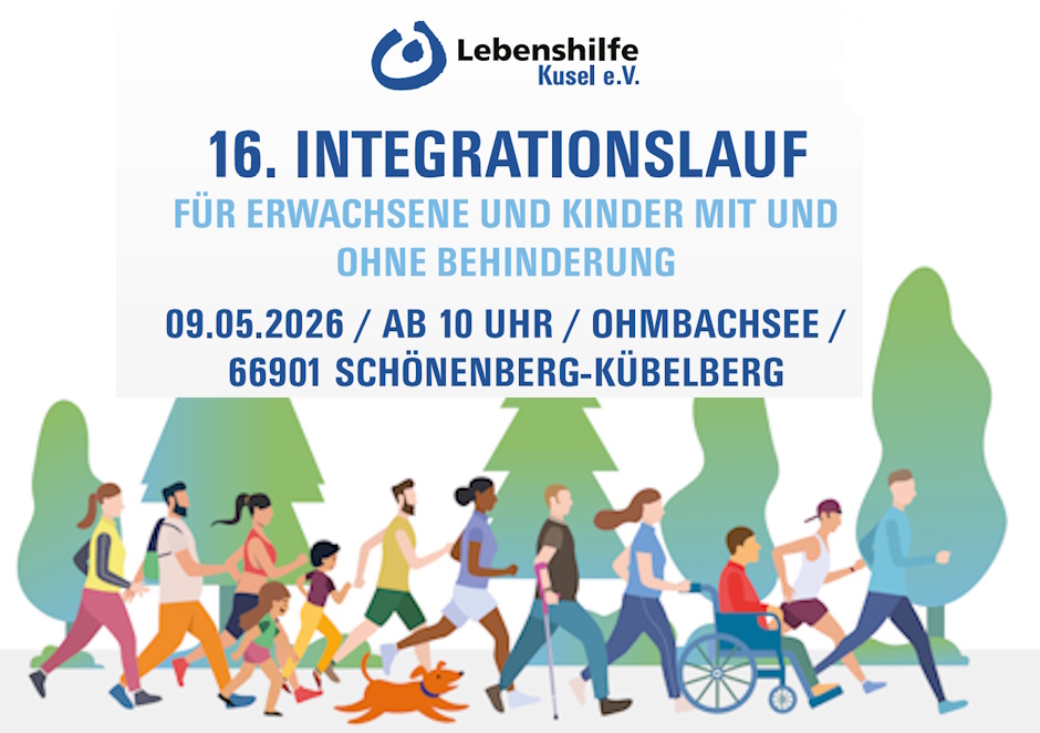 Am 09.05.2026 ist es wieder so weit: Die Lebenshilfe Kusel e.V. lädt herzlich zum 16. Integrationslauf für Erwachsene und Kinder mit und ohne Behinderung ein. Unter dem Motto „Mach mit! Sei auch Du dabei!“ erwartet alle Teilnehmerinnen und Teilnehmer ein tolles Sporterlebnis am Ohmbachsee (66901 Schönenberg-Kübelberg).