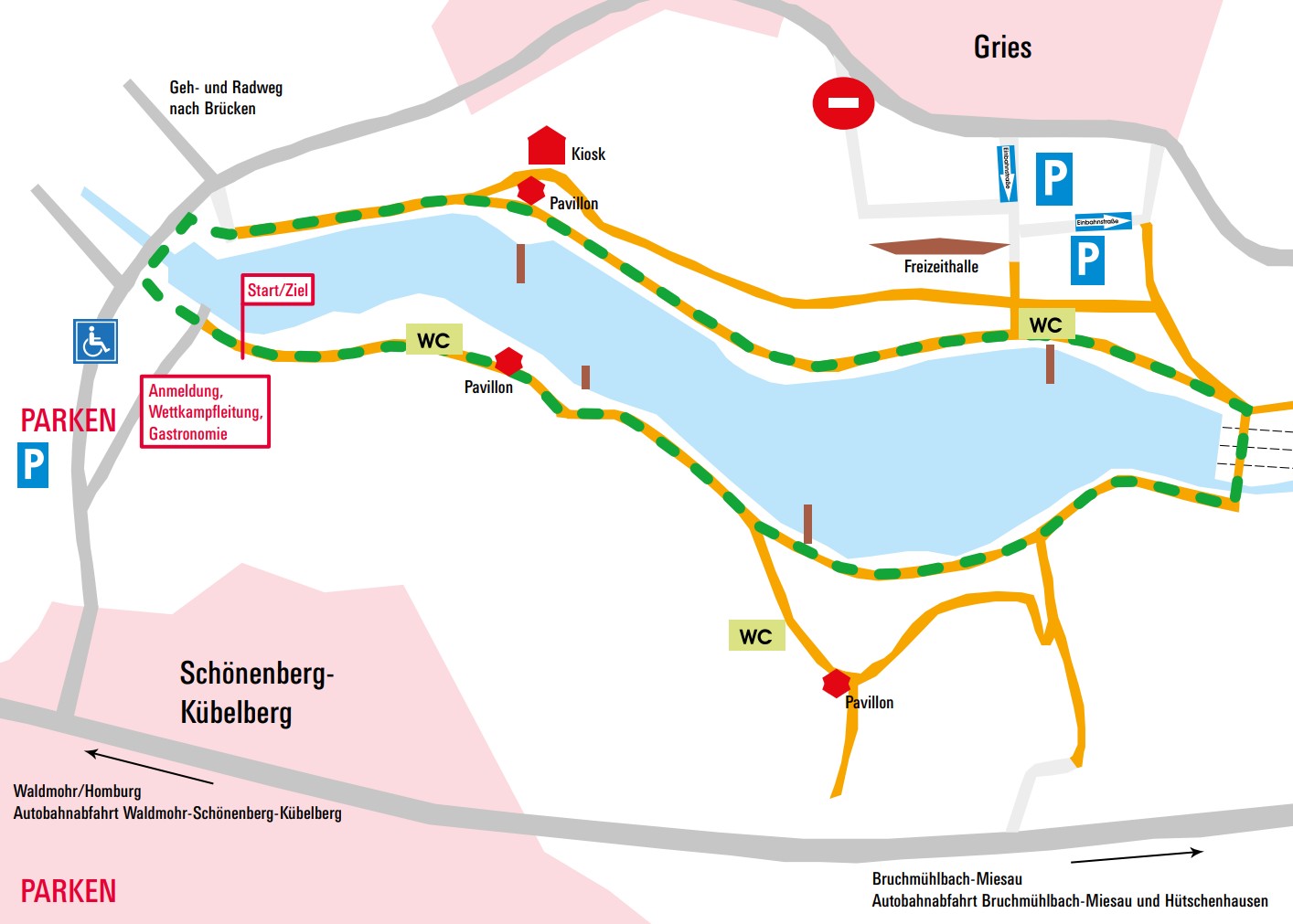 Auf dem Programm steht ein 2,5 km langer Hauptlauf, bei dem der See auf festen Wanderwegen einmal umrundet wird. Die Strecke ist sehr abwechslungsreich und komplett rollstuhlfreundlich gestaltet. Ob als Läufer, Geher, im Rollstuhl oder Sportrollstuhl – jeder kann mitmachen. Die Teilnahme ist natürlich mit oder ohne Begleitperson möglich. Für die Sicherheit aller Aktiven sorgen Sanitätsdienste des DRK sowie Streckenposten mit Getränken rund um den See.