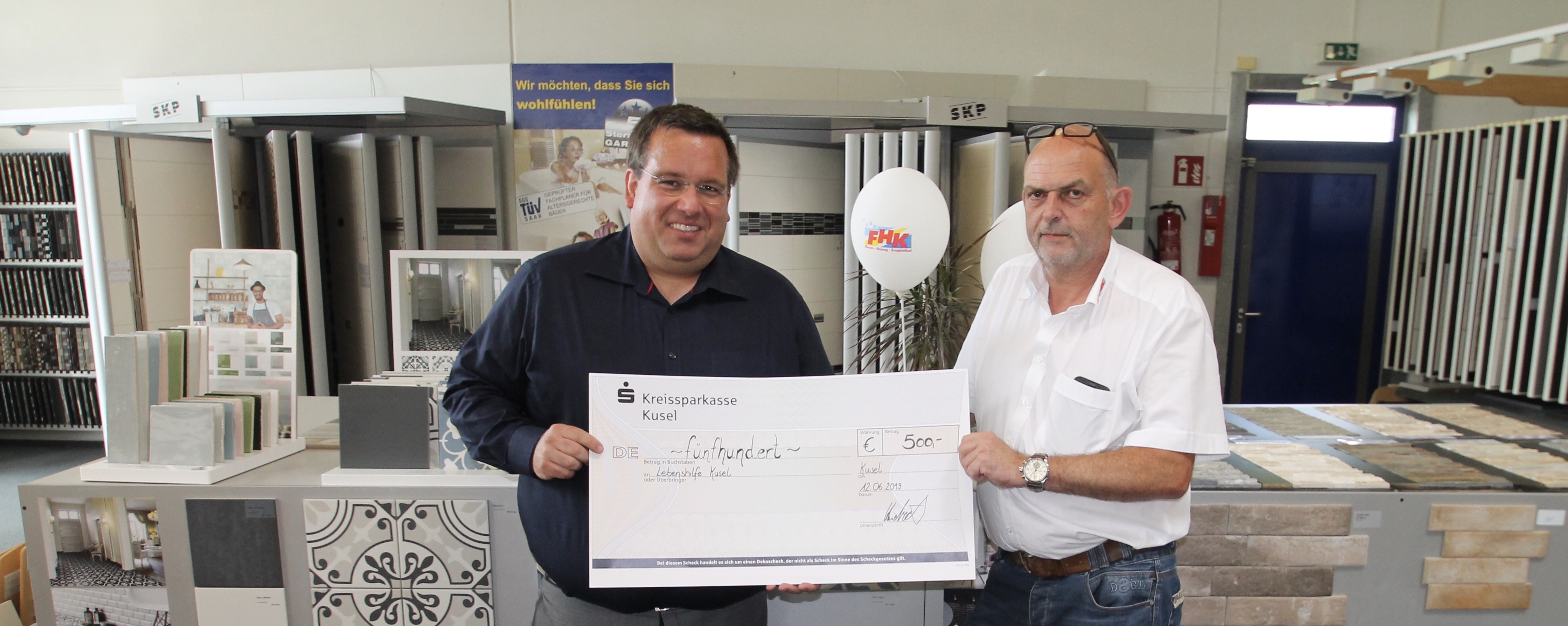 Klaus Heidrich, Geschäftsführer der der Fliesen Heidrich GmbH, übergibt einen Spendenscheck von 500 € an die Lebenshilfe Kusel. „Das soll vor allem für verschiedene Möglichkeiten der Freizeitgestaltung der Bewohner unserer Wohnstätte genutzt werden“, so Timo Schneider, Vorstand der Kuseler Lebenshilfe.