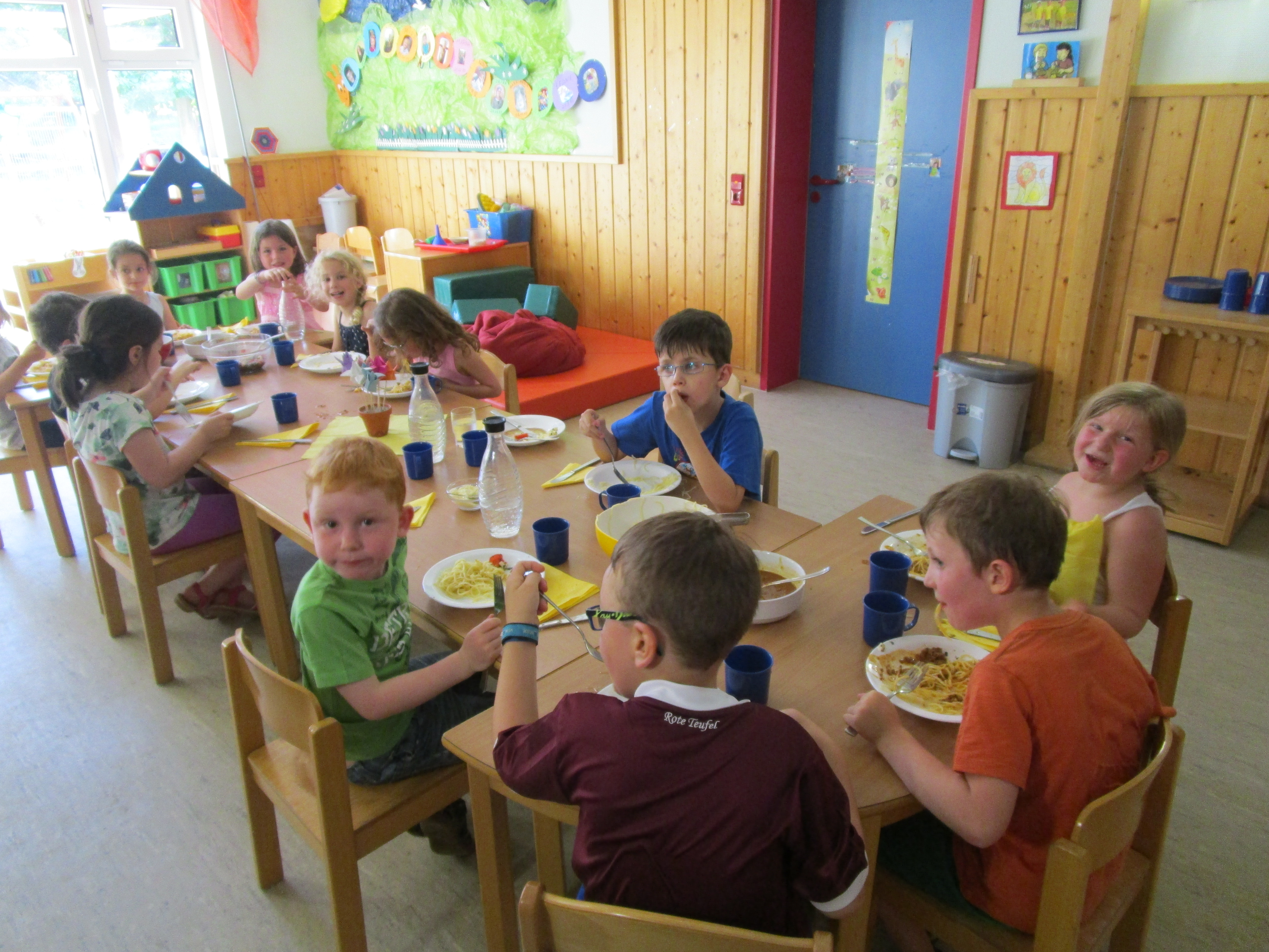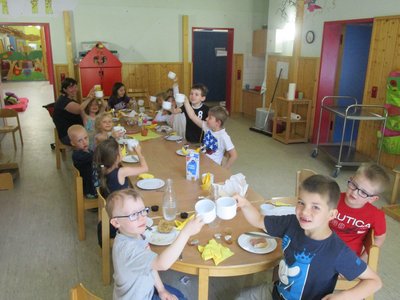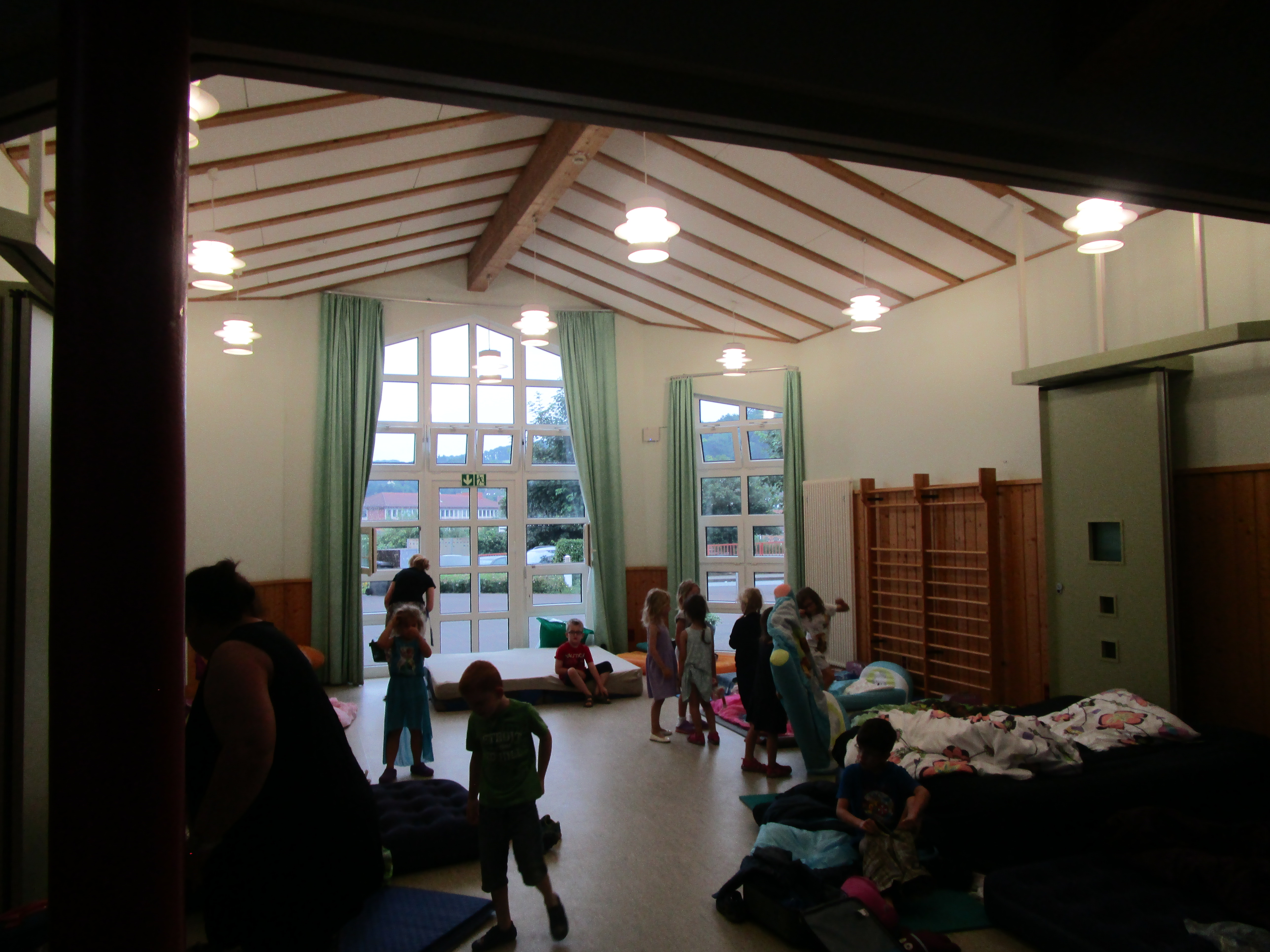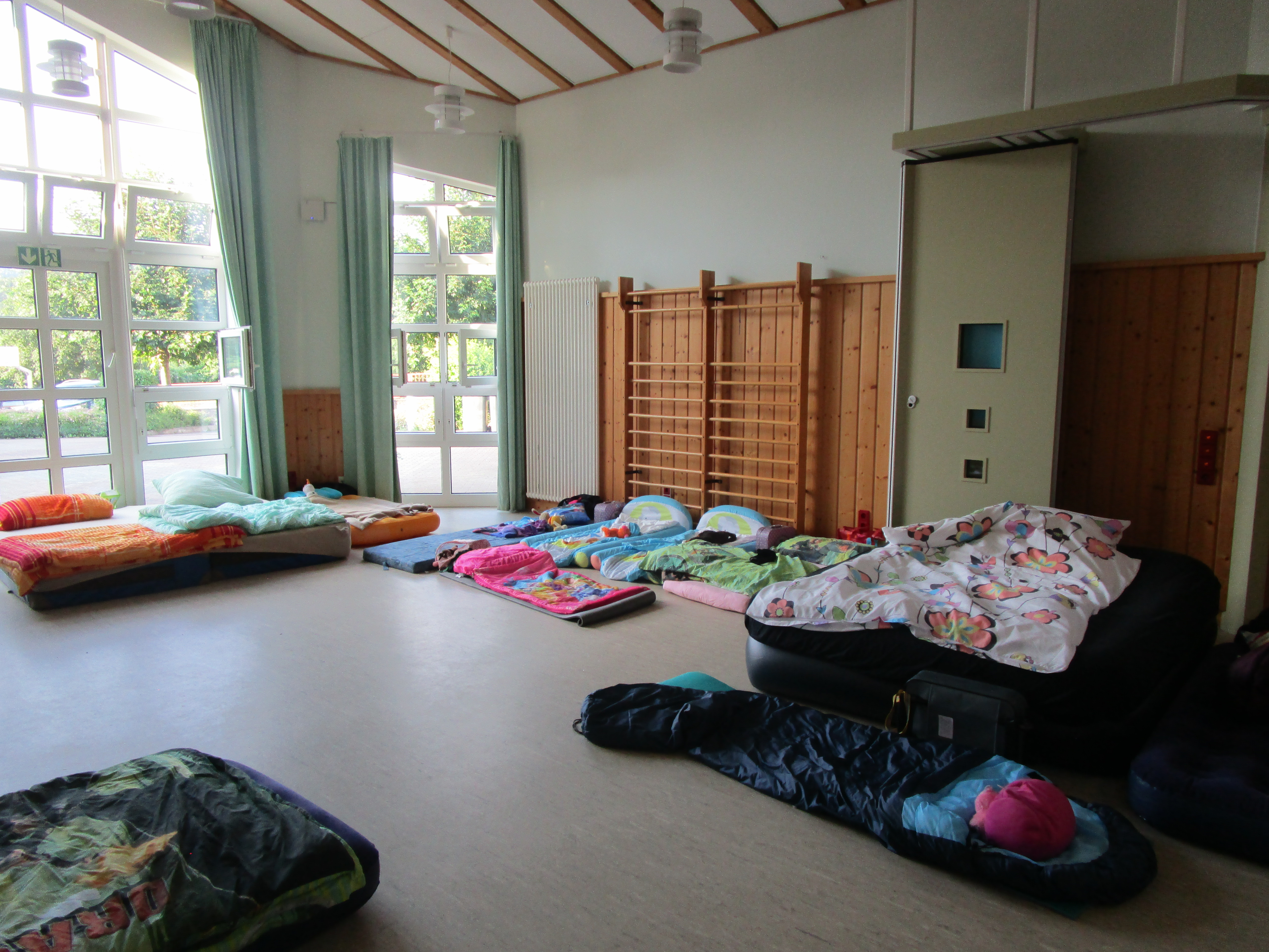 Am 24.06.2016 haben wir mit unseren 25 Vorschulkindern in der Kita übernachtet. Um 18.00 Uhr ging es los. Gemeinsam mit den Eltern haben wir unseren Schlafplatz eingerichtet und uns dann von den Eltern verabschiedet. Nach dem Abendessen ging es mit einer Stadt-Ralley durch Kusel weiter. Wir mussten verschiedene Rätsel lösen, die uns zu den unterschiedlichsten Plätzen von Kusel geführt haben. Das letzte Rätsel führte uns zur Eisdiele San Marco, wo es für jeden ein leckeres Eis gab. Mittlerweile wurde es schon dunkel und wir machten uns auf den Weg zurück zur Kita. Als endlich alle in ihren Betten waren, gab es noch eine Gute Nacht Geschichte und die Kinder schliefen nach diesem aufregenden Tag schnell ein. Am nächsten Morgen wurde nach dem Frühstück ein Abschluss – Stuhlkreis gemacht. Dabei bekamen die Kinder Madaillen von der Stadt-Ralley und ihre Sammelmappe mit all ihren gemalten und gebastelten Werken ihrer Kita Zeit. Als Abschiedsgeschenk von der Kita erhielt jedes Kind eine DVD mit einem Video von der Aufführung am Familienfest.